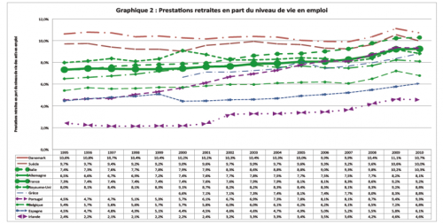 Source : Eurostat 2013 - Lecture : les niveaux des prestations retraites des deux pays sociaux-démocrates sont en rouge et restent sensiblement au niveau de 10% pour le Danemark et de 9% pour la Suède, soit plutôt au-dessus des autres pays. Ils restent stables et se gonflent légèrement au moment des crises de 2003 et surtout de 2009. Au-dessous, en vert, les prestations de retraite des cinq pays dont le système est plus installé augmentent à un rythme inégal, la Belgique restant en retard d’au moins 1 %. Néanmoins, tous les niveaux se gonflent aussi lors de la crise de 2009. En revanche, les quatre pays dont le système est en construction sont très dispersés : en bas, l’Irlande et l’Espagne restent à un faible niveau, même si les prestations s’y développent (respectivement de +89% et +36% en 16 ans) ; partant d’un niveau plus élevé, les prestations de retraite de la Grèce et du Portugal augmentent fortement (respectivement de +33% en 11 ans et +105% en 16 ans) alors que leurs contextes très différents n’ont en commun à partir de 2009 que le climat de crise minorant plus fortement leur dénominateur.