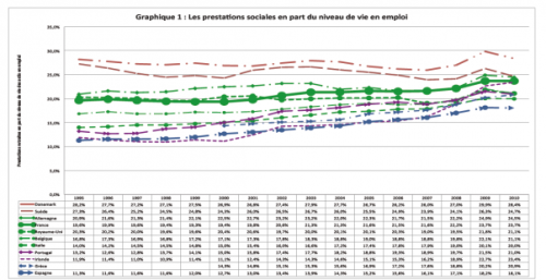 Selon ce mode d’analyse, le niveau moyen des prestations sociales est maximum au Danemark et en Suède : respectivement 27,5% et 25% du niveau de vie des actifs en emploi. Il est encore important dans des pays dont le système de protection sociale est le plus ancien tels l’Allemagne (22%), la France (21%), le Royaume-Uni (20%), la Belgique (18%) ou l’Italie (16,5%). Mais il est plus faible dans les pays européens dont les prestations sociales étaient encore à construire au début des années 1990, comme l’Espagne (15%), l’Irlande (16%) et la Grèce (14%).
