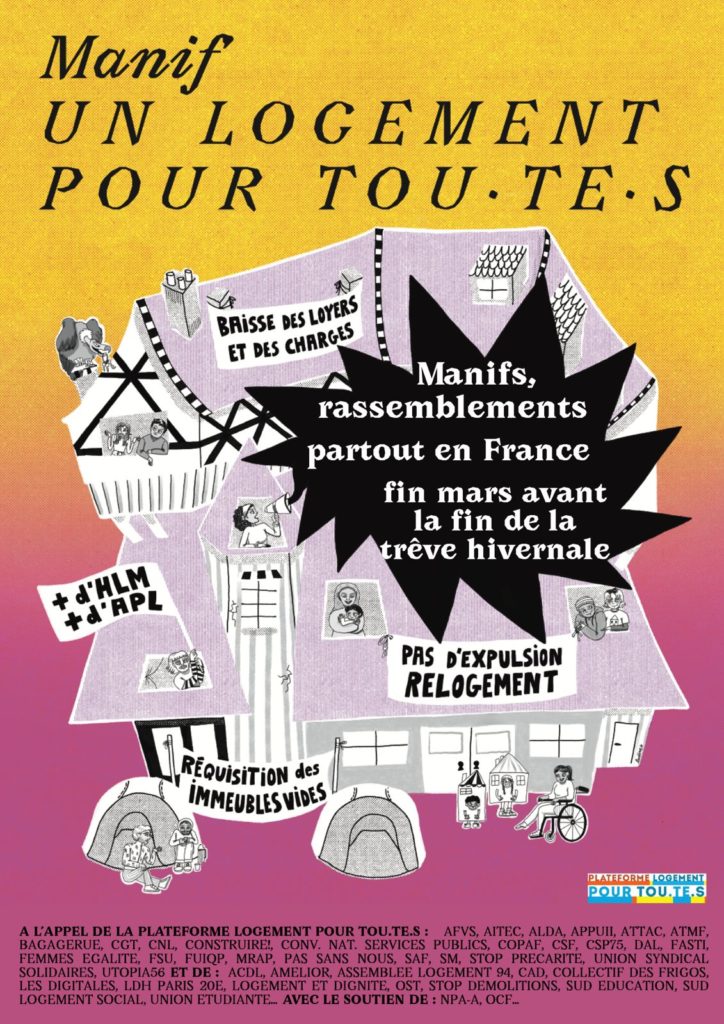 À l’appel de la plateforme Logement pour toutes : AFVS, AITEC, ALDA, APPUII, ATMF, Attac France, BAGAGÉRUE, CGT, CNAFAL, CONSTRUIRE ! , CONV. NAT. SERVICES PUBLICS, CNL, COPAF, CSF, CSP75, DAL, FASTI, FEMMES ÉGALITÉ, FSU, FUIQP, MRAP, PAS SANS NOUS, SAF, SM, STOP PRÉCARITÉ, UNION SYND. SOLIDAIRES, UTOPIA 56 Et de : ACDL, AMELIOR, ASSEMBLEE LOGEMENT 94, CAD, COLLECTIF DES FRIGOS, LES DIGITALES, LDH PARIS 20ÈME, LOGEMENT ET DIGNITÉ, OST, STOP DÉMOLITIONS, SUD ÉDUCATION, SUD LOGEMENT SOCIAL, UNION ÉTUDIANTE... Avec le soutien de : NPA-A, OCF...