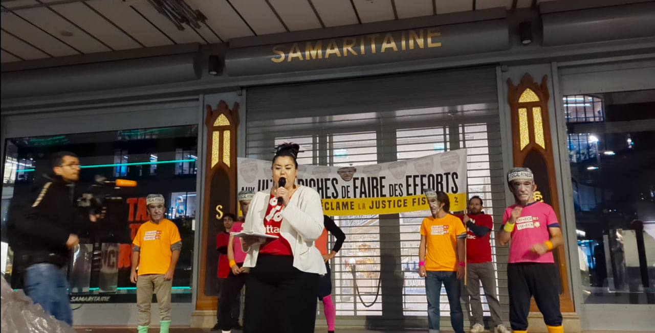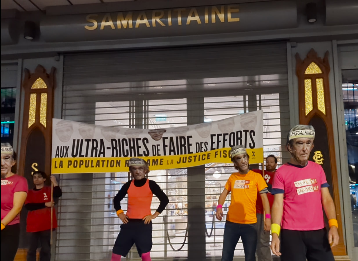 es tôt ce matin devant la Samaritaine, propriété de Bernard Arnault. Attac rappelle que la taxe Zucman ne vise que les ultra-riches qui pratiquent à outrance l’optimisation fiscale.Si Bernard Arnault veut y échapper, il lui suffit de payer ses impôts au lieu de les éviter ! En effet, l’objectif de la taxe Zucman est de faire en sorte que les impôts payés par les 1800 foyers fiscaux les plus riches représentent au moins 2% de leur patrimoine.