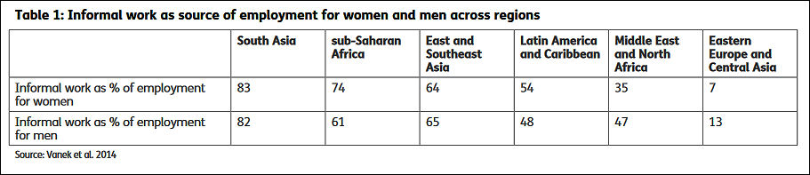 Pour situer l’article, on indique ici la substance de la conclusion. Malgré l’intérêt manifesté par le FMI à l’égard de l’égalité entre les sexes, les auteures estiment son efficacité limitée ; il en va de même pour les classes. En effet, démontrent-elles, sans remettre en cause les fondements même de la « doctrine » (objectifs monétaires et budgétaires, flexibilité et privatisation), il n’y aura pas de progrès substantiels. Elles ont parfaitement raison, le capitalisme n’est fait ni pour l’amélioration du sort des femmes ni pour celle des classes défavorisées. Son but est de distribuer du dividende. On verra, par exemple, le tableau 1 reproduit ici, qui met en évidence ce que les IFI dénomment depuis des décennies, le travail informel ; pour être plus explicite, il faudrait dire, que ceux qui en « bénéficient », sont taillables et corvéables à merci. Ainsi, trois quarts des femmes africaines au travail sont sous ce statut et plus de 80 % en Asie du Sud tant pour les femmes que pour les hommes. Pas de protection sociale, d’aucune sorte Il faudrait au contraire, disent-elles, largement développer cette protection sociale [1], ainsi que, d’une manière générale, les services publics.