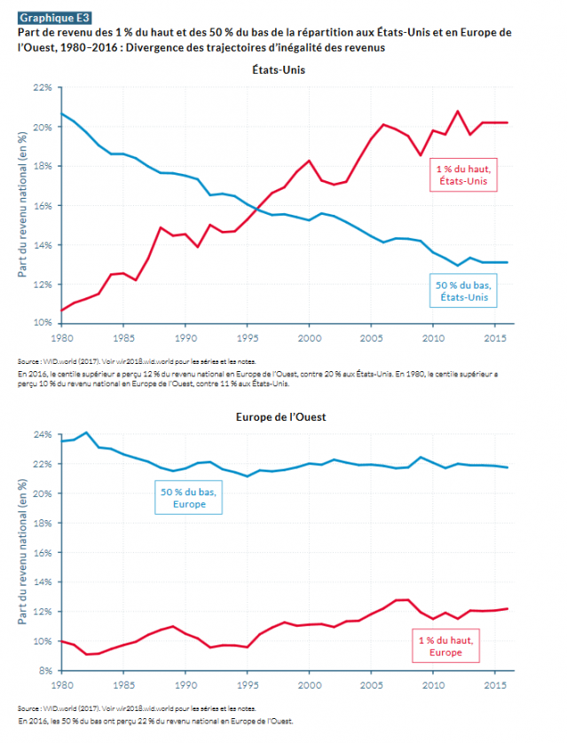 Le graphique E3 montre sur les 35 années allant de 1980 à 2015 comment ont évolué la part des revenus des 1 % les plus élevés et celle des 50 % les plus bas, tant aux États-Unis qu’en Europe de l’Ouest. L’observation de ces quatre courbes illustre parfaitement que les combats sociaux sont de première importance contre l’extravagance de l’accaparement par les riches des revenus résultant du travail de tous. On comprend aussi ce qu’indique le rapport de Capgemini évoqué plus haut : les États-Unis comptent près de 30 % des millionnaires dans le monde.